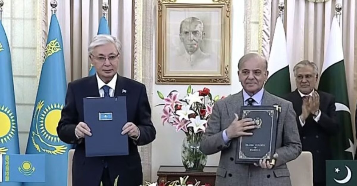 Премьер-министр Шахбаз Шариф и президент Касым-Жомарт Токаев подписали совместную декларацию на церемонии заключения меморандумов о взаимопонимании и соглашений о сотрудничестве в различных областях в Пакистане и Казахстане.